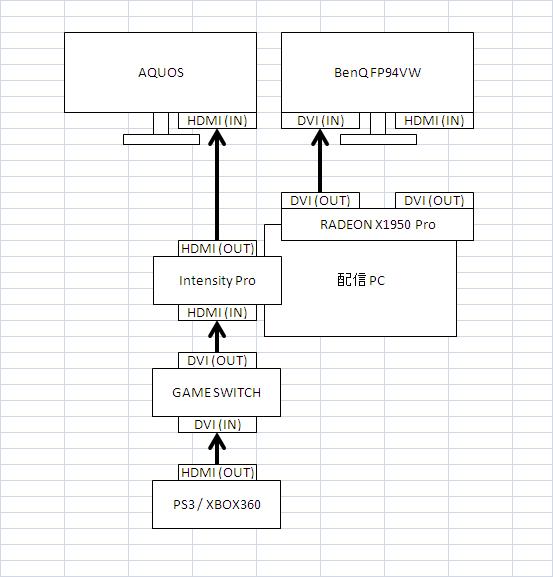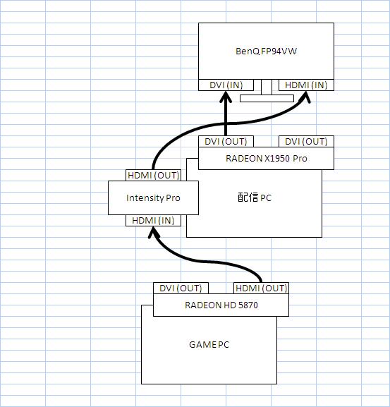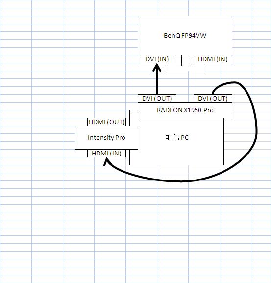 2PCの時はクローン出力でDVI側をIntensityに、HDMI側をモニタへ。